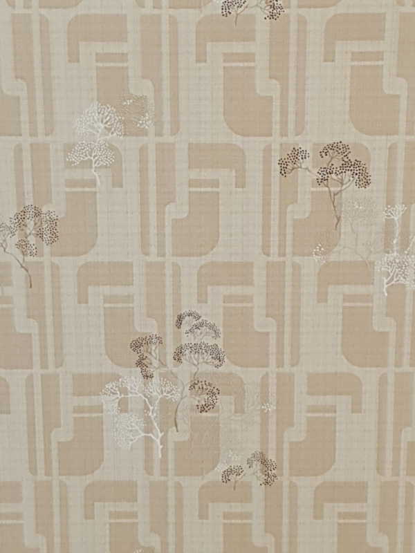 Een grafisch patroon van blokvormige lijnen in beige en wit, met daarover losse takjes in wit en bruin. De ondergrond heeft een fijn lijnenspel dat het dessin extra tekening geeft.