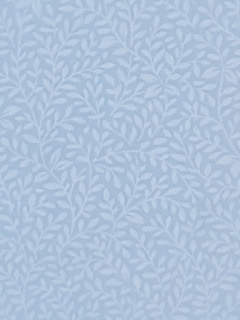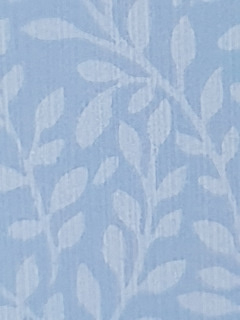 Fijne takjes met kleine blaadjes lopen over de baan in twee blauwtinten. De ondergrond en het motief liggen dicht bij elkaar van kleur, zonder wit in het dessin.